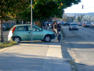 - Először a műegyetem rakparton létesített kerékpárút elbitorlásának szép példáját mutatom meg. Akkoriban naponta jártam arra. Tény, hogy nehezen lehetett parkolóhelyet találni, de aki ide be tudott állni közel 90°-ban, annak az égvilágon semmi sem indoka nem volt arra, hogy az orra ennyire kilógjon - rá a járdára, kerékpár útra. Egyszerűen csak magasról tett rá. (Mondjuk az, hogy egyúttal sikerült, a fűre is felállnia, csak sofőrünk teljesség iránti igényét jelzi.) Szerencsémre, amikor a fotót készítettem, egy drótszamaras demonstrálta is azon melegében a problémát. Lehet persze azt mondani, hogy "de hisz' elfért, mi itt a gond!?", de ne felejtsük el, hogy az ott elvileg még egy járda is!